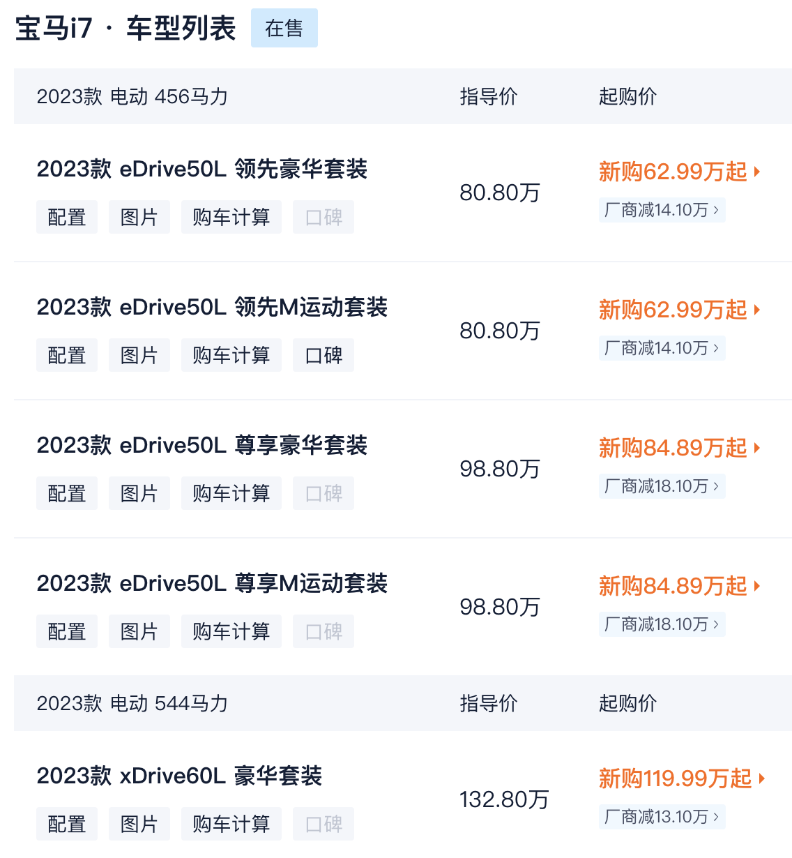 界面新闻注意到,此次降价覆盖燃油车与新能源车型,主力产品降幅尤为显著。其中,顶级旗舰纯电车型i7 M70L从189.9万元直降至159.8万元,成为降幅最大的车型;i7 eDrive50L尊享型降价18万元,从116.9万元降至98.8万元;7系燃油版735Li从91.9万元降至80.8万元,740Li领先型从106.9万元降至93.8万元,降幅均约12%。